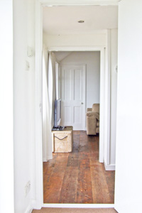 The antique pine floor throughout helps this process. Both of the main bedrooms are carpeted.
