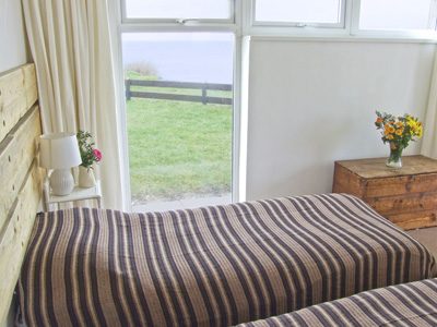 In front of the main living area is the `Sun room` it has windows all around with wooden blinds - extraordinary sea panoramas of course! - two single beds, which also double as seating areas in the day. This room can be closed off from the main living areas by two wooden bi-fold doors. There are occasional tables, and a large scrubbed pine coffee table, plus low lamps.